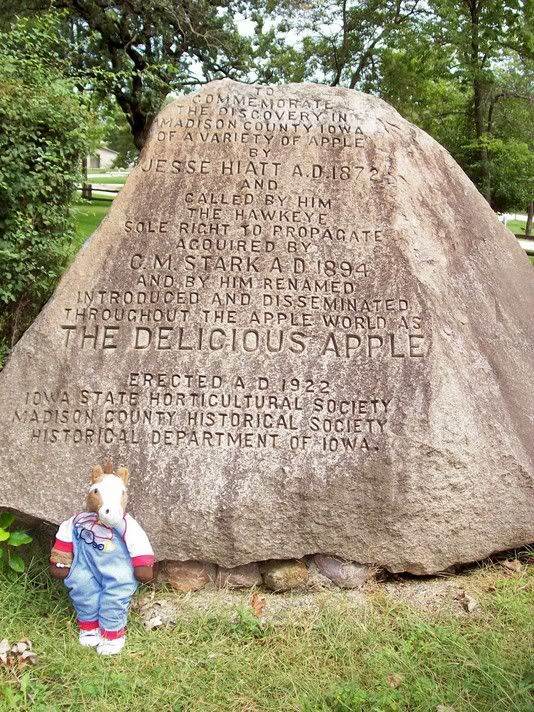 That the delicious apple was first cultivated in Iowa by Jesse Hiatt in 1872. He called it the Hawkeye. This stone in Madison county tells all about it. I really like apples.