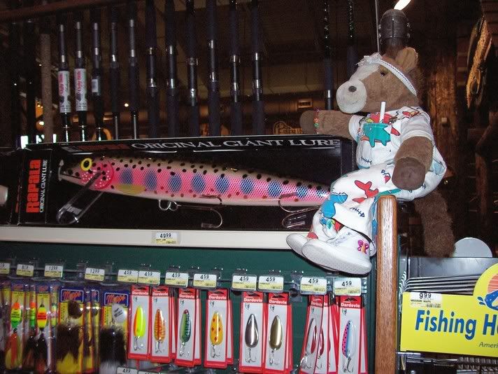 the other day at Bass Pro shops. I think I will get Mom one of these giant lures. [as soon as I decide which one] She has decorated our home like a cabin. She has a fishing net on the wall in the family room. It is filled with pictures of family and also has lures and bobbers scattered among the pictures. There is even a picture of